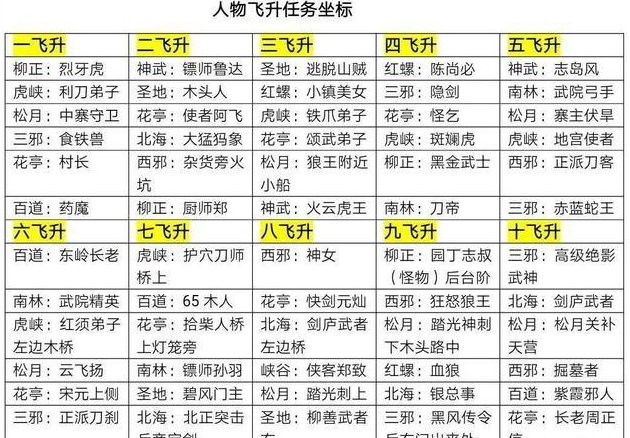 飞升任务坐标:角色每一次飞升,要做完六个飞升活动。详细坐标如图为。