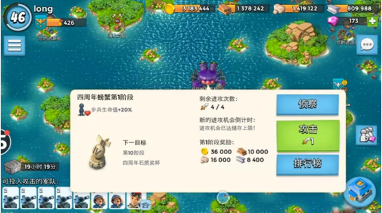 超级螃蟹是一款闯关类活动,具体总关卡数小编也不太确定,我目前看到的最高关卡是55关。参与攻打超级螃蟹的玩家,在活动期间可以通过闯关获取相应奖励。活动开启时会给玩家赠送一定次数的闯关机会(最多40次),要是闯关次数不够了,系统就会每隔一段时间自动恢复1次闯关次数。