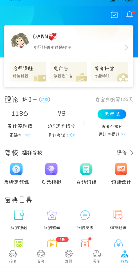 5.点击“我的”一栏就能进入个人中心页面。在这个页面里,用户可以购买名师VIP课程,课程中包含各类考试项目的优惠套餐,同时还能进行通过率预测。此外,用户也能查看自己所学考试项目的平均分、正确率等学习数据。个人中心还支持用户确认已报名的驾校,确认后点击“在线约课”按钮,就能向该驾校的教练预约课程。