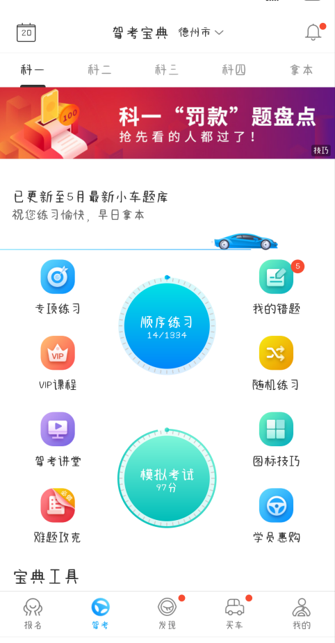 在宝典工具里,能查看自己的错题、收藏以及浏览记录等内容。点击“题库设置”就能切换或者更新题库。在我的圈子中,可加入地理位置相近的小圈子,在这个地方能寻找车友,和大家一同探讨技巧方法等。