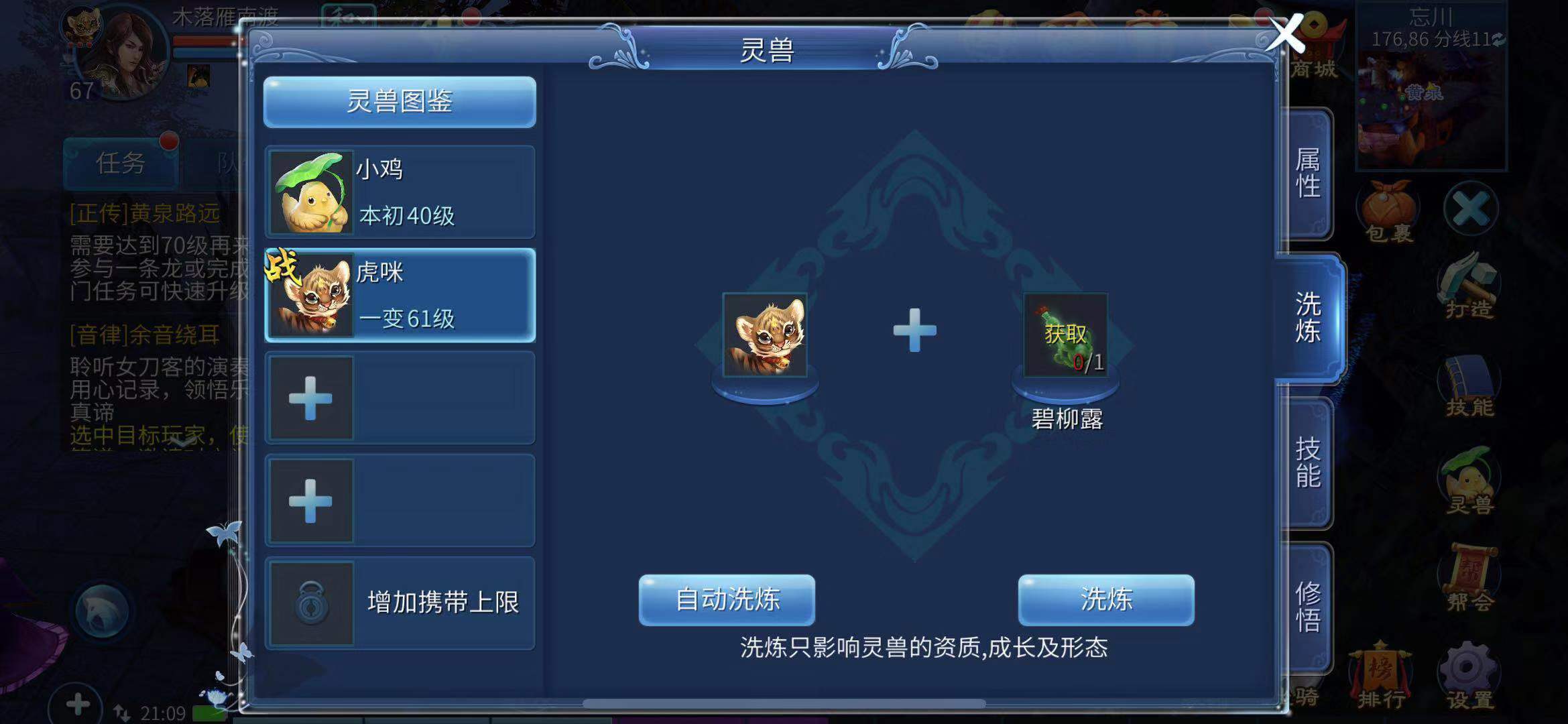 玩家能够借助碧柳露这一道具对灵兽展开洗炼操作。经过洗炼,灵兽的资质与外形均有机会产生改变——既可能让原本的模样变得更为美观,也能够提高灵兽的评级以及成长值。每次洗炼都会消耗一个碧柳露道具,洗炼后出现的新属性,玩家可以自行决定是放弃还是保留。要是玩家攒够了足够的洗炼道具,还能运用自动洗炼功能来一次性完成多次洗炼,系统会自动为玩家保留最为出色的洗炼结果。而碧柳露可以在商城和易市中购买到,其售价十分低廉。
