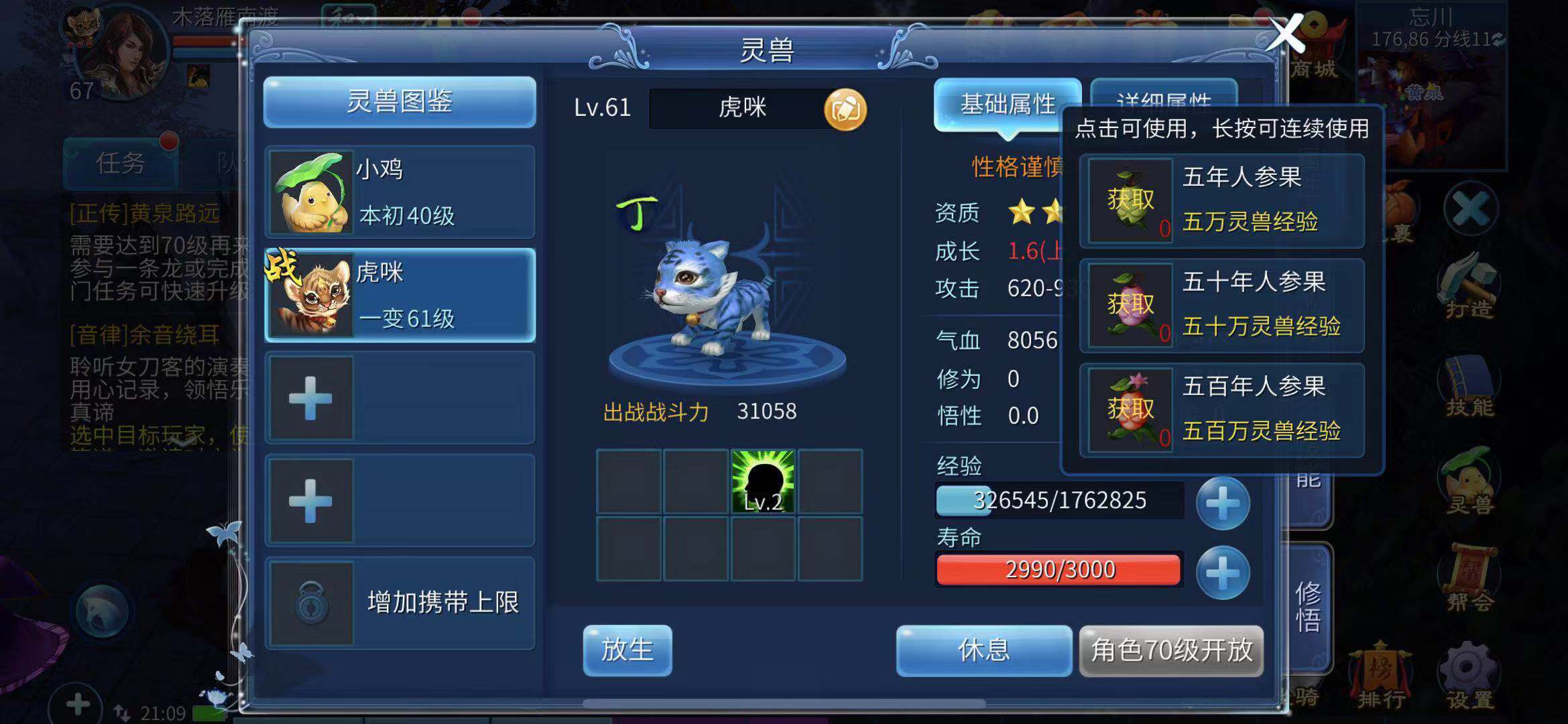 灵兽的战斗力与其等级关联紧密,玩家获取新灵兽后,首要任务便是提升其等级。玩家可带领灵兽前往适合自身的地图刷野怪升级,不过这种方式耗时较长;另一种方法是使用经验果,经验果有五年、五十年、五百年三种,年份越高提供的经验越丰厚,这些经验果可在商城和易市购买。