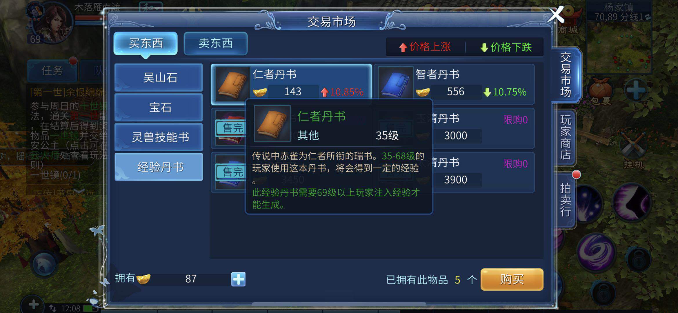 玩家也能选择购买经验,在六十九级之前(不含六十九级),可以在易市里购买并使用名为“仁者丹书”的道具。该道具由六十九级及以上玩家注入经验后售卖,使用后可直接获得约一百三十多万经验,足以助力快速升级。此外,玩家每日最多可使用四本仁者丹书,通过这种方式一天能获取五百多万经验。