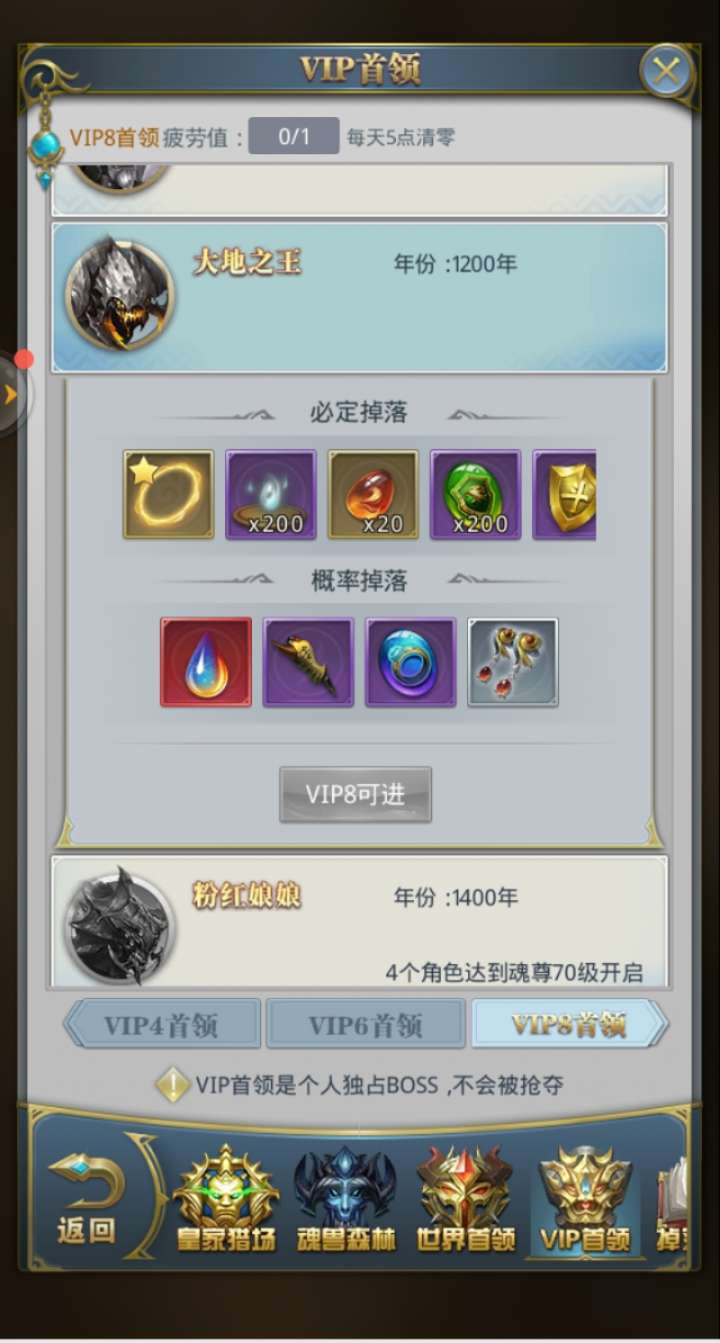 在魂兽森林进行挑战是有次数限制的,并且支持多人共同参与,系统会依据玩家造成的伤害值进行排名,排名越靠前,能拿到的奖励就越丰厚。因此,这对玩家的战力有一定要求。要是战力不够,又想获取好奖励,那就只能选择在夜深人静的时候去刷魂兽,这样就不会有人和你争抢了。此外还有一种方法,就是充值成为VIP,VIP拥有专属的魂兽资源,相当于独占一片区域,而且能获得的奖励也相当不错。