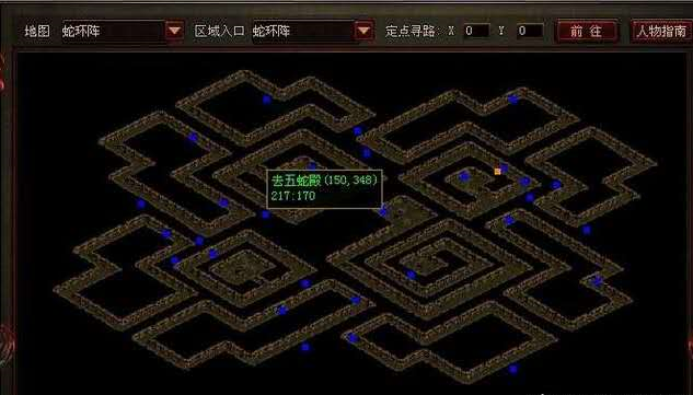第七步,选择蛇环阵(坐标288、122),进入后就能看到五蛇殿,通往五蛇殿的坐标只能选150、348,其他门是进不去的。进去就能看到“小三”,这一路确实不好走!