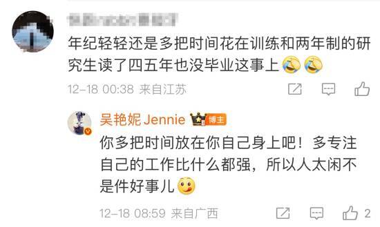 有网友在相关内容下评论,建议吴艳妮将更多时间投入训练,同时提及她两年制研究生读了四五年仍未毕业的情况。12月18日,吴艳妮对这条评论作出回应,表示“你还是多把时间放在自己身上吧,多专注于自己的工作比什么都重要,所以说人太闲了真不是什么好事”。