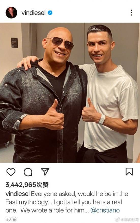 近日,“速度与激情”系列电影的主角范·迪塞尔在个人社交平台上发布了一张他与C罗的合影,同时配文表示:不少人都来询问,C罗是否会加盟“速激”大家庭……而他想告诉大家,这件事是真的,团队已经专门为C罗量身打造了一个角色。此外,范·迪塞尔还在这条动态的末尾艾特了C罗本人。