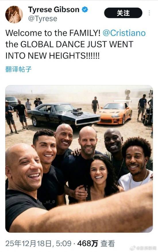 12月18日,曾在“速激”系列电影中扮演罗曼的泰瑞斯·吉布森,于个人社交平台发布了一张《速度与激情11》剧组的工作照,C罗的身影出现在照片里。然而,这张图片也引发了是否由AI生成的质疑。