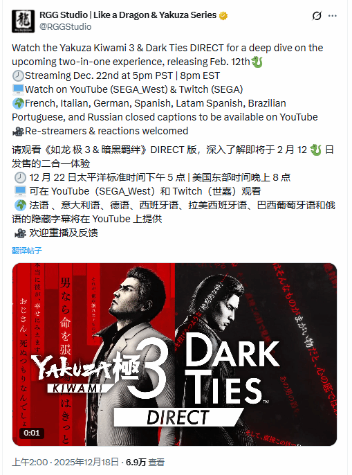 如龙工作室(RGG Studio)今日正式宣布,计划在北京时间12月23日上午9点举行2025年的最后一场专题直面会。