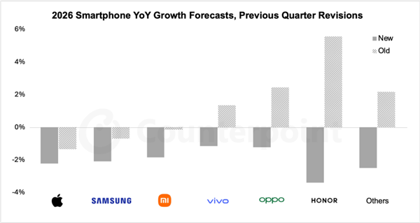 整体而言,2026年几乎所有主流厂商的出货量都有可能出现同比下降的情况,但三星、小米、苹果这类头部品牌凭借自身的规模优势,抗风险的能力会相对更强。