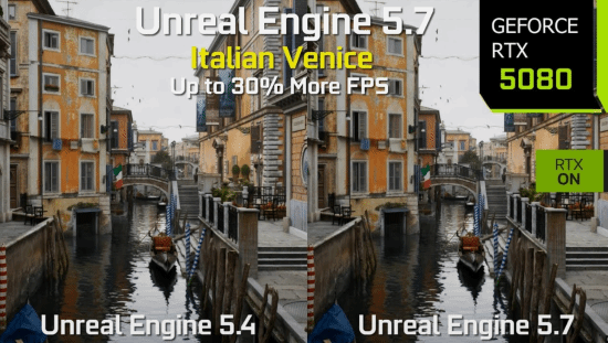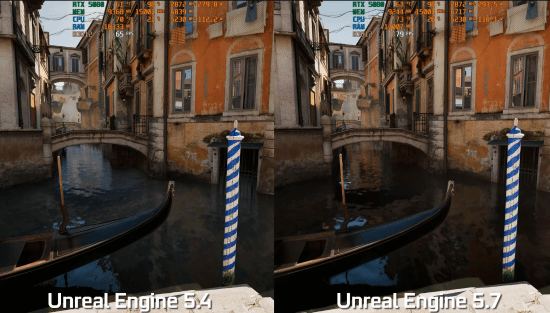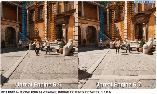 近日,YouTube频道MxBenchmarkPC推出了一则全新对比视频,把采用虚幻引擎5.4版本与5.7版本运行的《Photorealistic Venice》技术演示进行同屏对照,清晰呈现出引擎新版本在性能方面的优化提升。