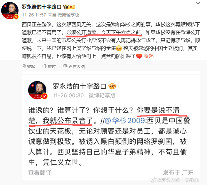 12月19日,华与华举行创意比赛,华杉也将进行自己的年度演讲。对此,罗永浩转发并配文:择日不如撞日,要不然就今天公布录音?