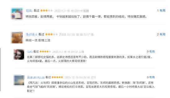 给出评论的用户们大多认为,这部作品的特效还是那么震撼,延续了《阿凡达》系列独一无二的水准。不过剧情方面真的有点让人不知该如何评价,不少人觉得“太过套路,结局完全能预料到”。