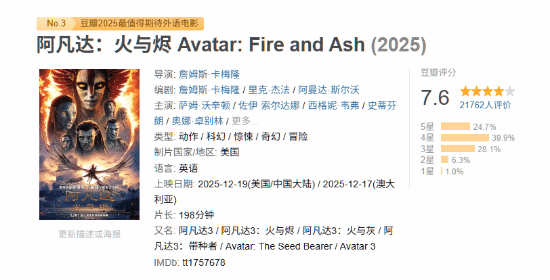 备受影迷期待的卡梅隆新作《阿凡达:火与烬》(即《阿凡达3》)今日正式登陆银幕!截至目前,该片的豆瓣评分已新鲜出炉,最终获得了7.6分的成绩!