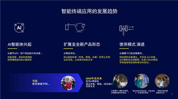 这种变化不仅影响用户行为,也正在重塑终端生态。近年来,高通推动的终端布局已经从手机扩大到 AI PC、XR、可穿戴设备、智能网联汽车等多个领域,每一种终端都将成为数据生成与处理的重要节点。“智能体 AI 在不同终端运行将产生大量数据,终端侧数据需要传给云端,这将进一步推动对于网络和流量的需求,重塑业务形态与流量模型。”徐晧强调。
