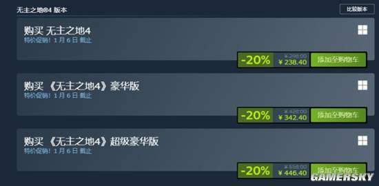 目前《无主之地4》已进入游戏体验稳定、内容持续更新的良性发展阶段。正值Steam冬季促销开启,该作迎来了发售至今力度最大的超值折扣:游戏本体八折优惠,仅需238元即可购买;包含后续DLC的豪华版与超级豪华版同样享受八折,分别售价342元和446元。