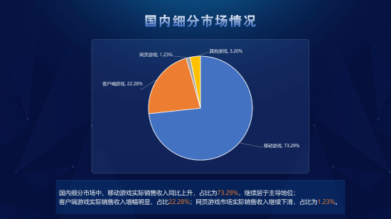 在国内游戏细分市场里,移动游戏的实际销售收入实现同比增长,占比达73.29%,依旧占据主导地位;客户端游戏实际销售收入的增长幅度较为显著,占比为22.28%;而网页游戏市场的实际销售收入则持续下降,占比仅为1.23%。