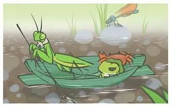 15、河边打水:青蛙在河边打水,看到蚂蚁们在河里运食物。