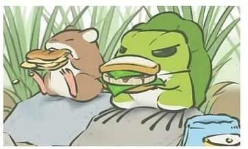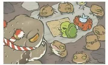 3、石头上吃饭:青蛙和小伙伴坐在石头上吃东西。