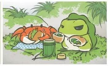 6、草地野餐:青蛙和朋友在草地上吃东西。