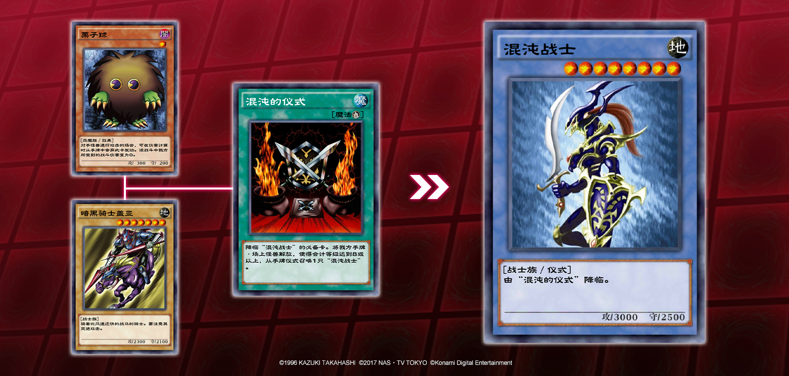 比如,当手牌与场上同时凑齐等级7的“暗黑骑士盖亚”和等级1的“栗子球”时,启动“混沌的仪式”,把符合等级条件的怪兽解放,就能从手牌将一只“混沌战士”以仪式召唤的方式召唤到场上。