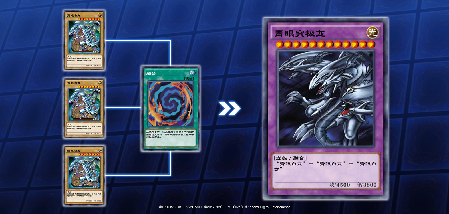 以融合怪兽“青眼究极龙”来说,它需要的融合素材是3只“青眼白龙”。当自己的场上和手牌里凑齐3只“青眼白龙”时,使用“融合”魔法卡,把凑齐的这3只“青眼白龙”送入墓地,就能从额外卡组把“青眼究极龙”特殊召唤到场上了。
