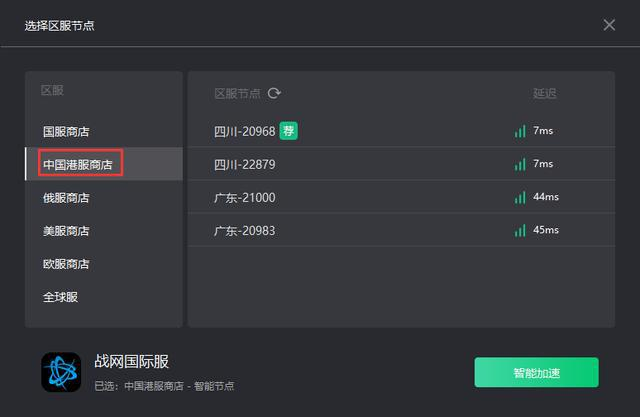 安装完成后,搜索“战网国际服”,接着选择“中国港服商店”来执行加速操作。