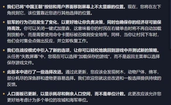 这次更新,官方不仅对游戏内的文明势力进行了平衡性调整,还优化了地图显示效果,让玩家能更轻松地在小地图上识别战略资源。此外,部分界面的显示布局也做了调整,以便玩家在游戏过程中更快捷地获取所需信息、进行操作。