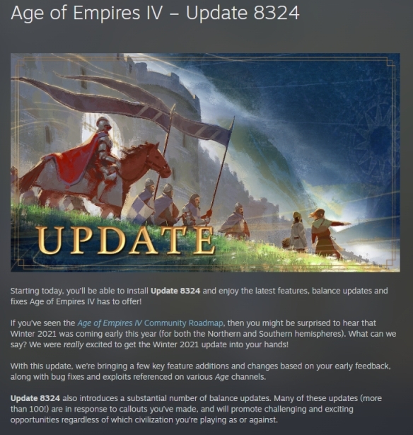 《帝国时代4》官方今日发布公告,2021年冬季更新包已正式登陆Steam与微软平台,玩家目前可前往下载,本次更新版本号为8324,主要对地图、界面显示效果以及各文明势力的平衡性进行了优化调整,具体内容一起来了解一下吧。