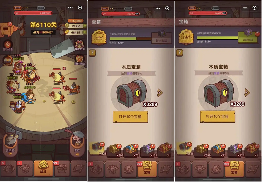 2. 挂机达到特定时长也可获取宝箱奖励,《咸鱼之王》挂机多久收益最佳呢?需要记住的是,务必挂满8小时05分钟,才能领取到3个木质宝箱和2个青铜宝箱的奖励;若挂机时长不足8小时,就无法获得那2个青铜宝箱了。