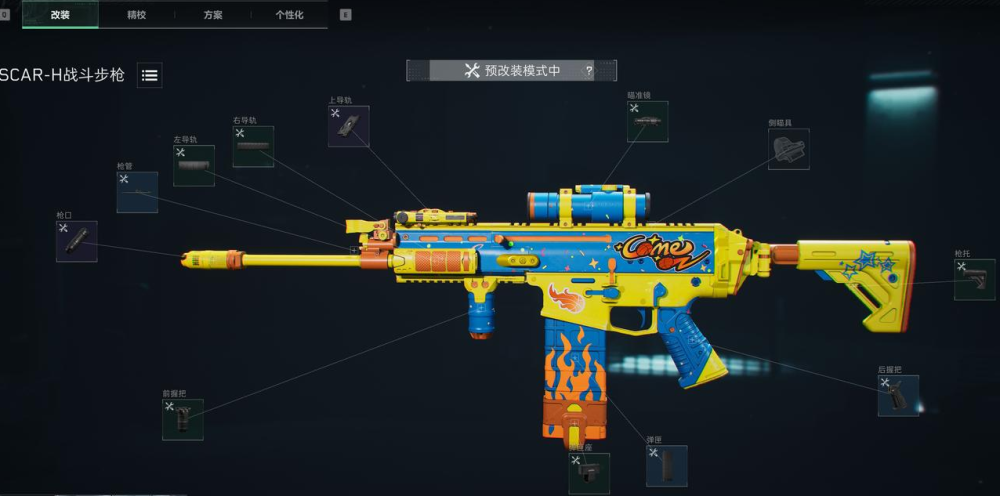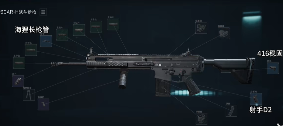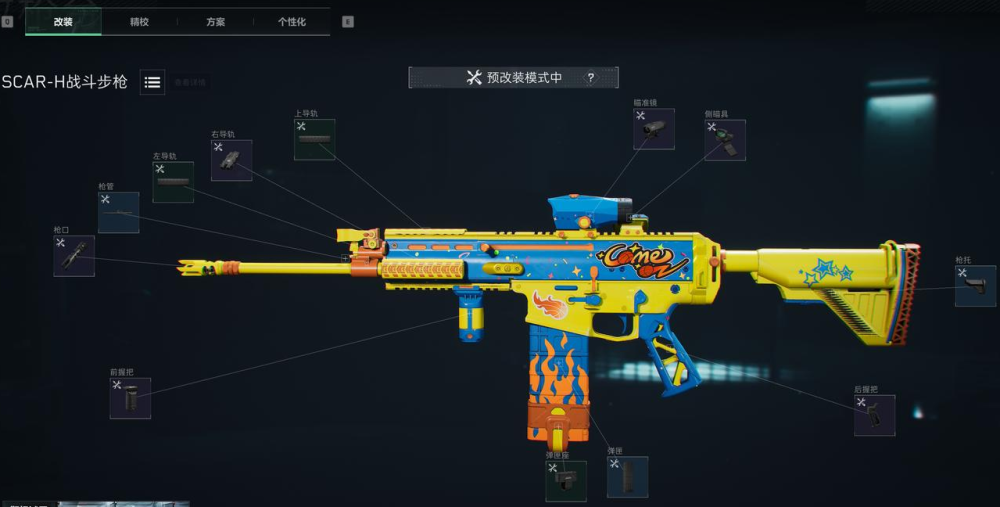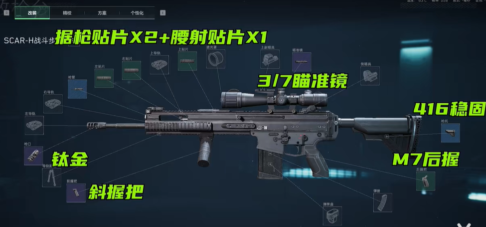 SCAR-H的满配改装方案代码是:6G5EB000EU90O684D8QL5;这套满改配置建议搭配倍镜使用。