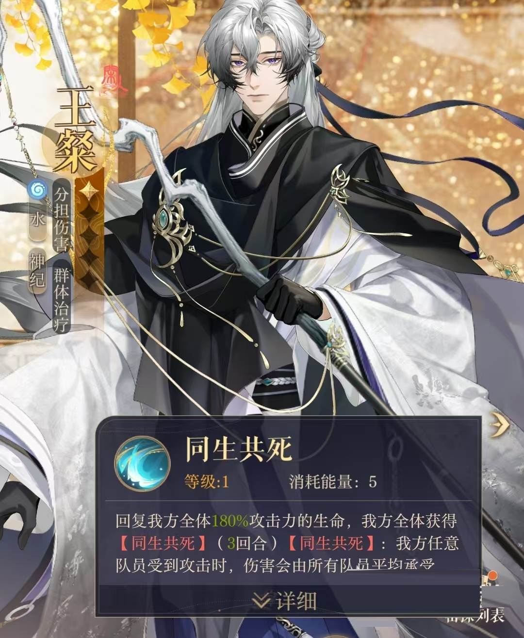 技能【同生共死】:为我方全体回复相当于自身攻击力180%的生命值,同时我方全体将获得【同生共死】状态。在此状态下,当我方任意一名队员遭受攻击时,该次伤害将由所有队员共同平均分担。随着技能等级的提升,其生命回复效果还可进一步增强至185%与190%。