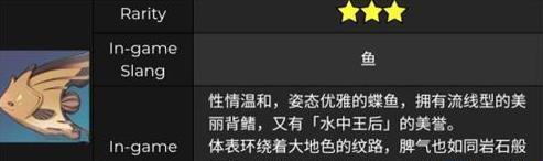 流纹褐蝶鱼属于三星蝶鱼类,性情温和,背鳍呈流线型,性子如同岩石般沉稳,常常在水中静止不动;它是蝶鱼的一个种类,区别在于身体呈褐色,并且性格温顺,是相对容易钓获的鱼类,同时也是珍贵的观赏鱼,能够被饲养在灵沼云池中。接下来,本站小编将为大家整理原神流纹褐蝶鱼的垂钓位置以及相关钓鱼攻略: