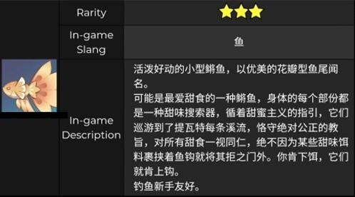 这或许是鳉鱼中最嗜甜的一类,全身上下的每一处都像是为搜寻甜味而生的探测器。在对甜蜜滋味的执着追寻下,它们的身影遍布提瓦特大陆的每一条溪流。它们始终坚守着绝对公正的准则,对待所有甜食皆平等相待,绝不会因某些甜