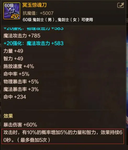 也就是常说的“爆伤太刀”,它能提供60%的暴击伤害加成,处于战斗状态时还会额外获得总计25%的力量与智力加成,整体伤害上限比较高,但需要留意暴击率是否达标,不然暴击伤害的收益会被稀释。