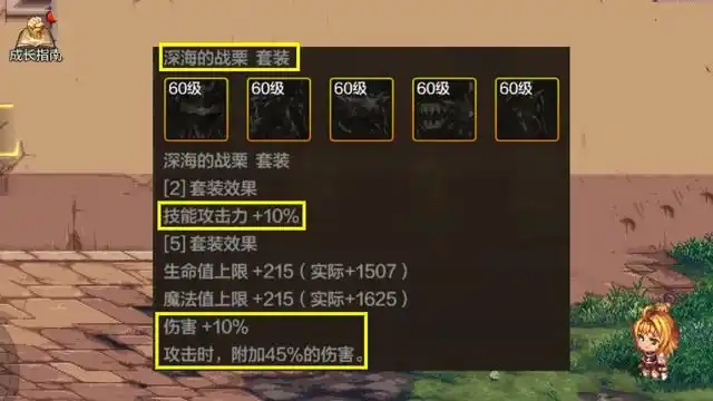 :60级黎明祈祷套,即 “属强套”,总计增加 60 点全属性强化,提供 22% 技能攻击力加成以及 10% 的白字属性伤害。