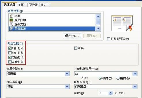 1.佳能e568打印驱动默认开启了旨在节省纸张的“2合1”与“双面打印”功能,此外还提供“4合1打印”选项,以此实现纸张利用的最大化。