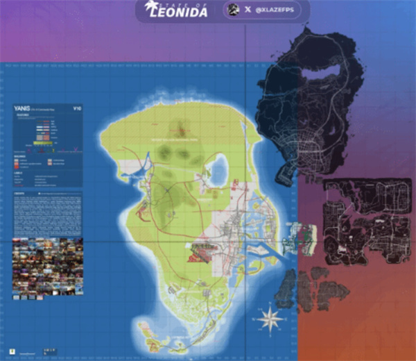 有玩家分享了一张关于《GTA 6》地图的图片,并配文说明,这张图来自Laze制作的GTA 6地图项目网站,目前已经提供了《给他爱5》《GTA 4》《GTA:圣安地列斯》以及《GTA:罪恶都市》的地图比例对比。