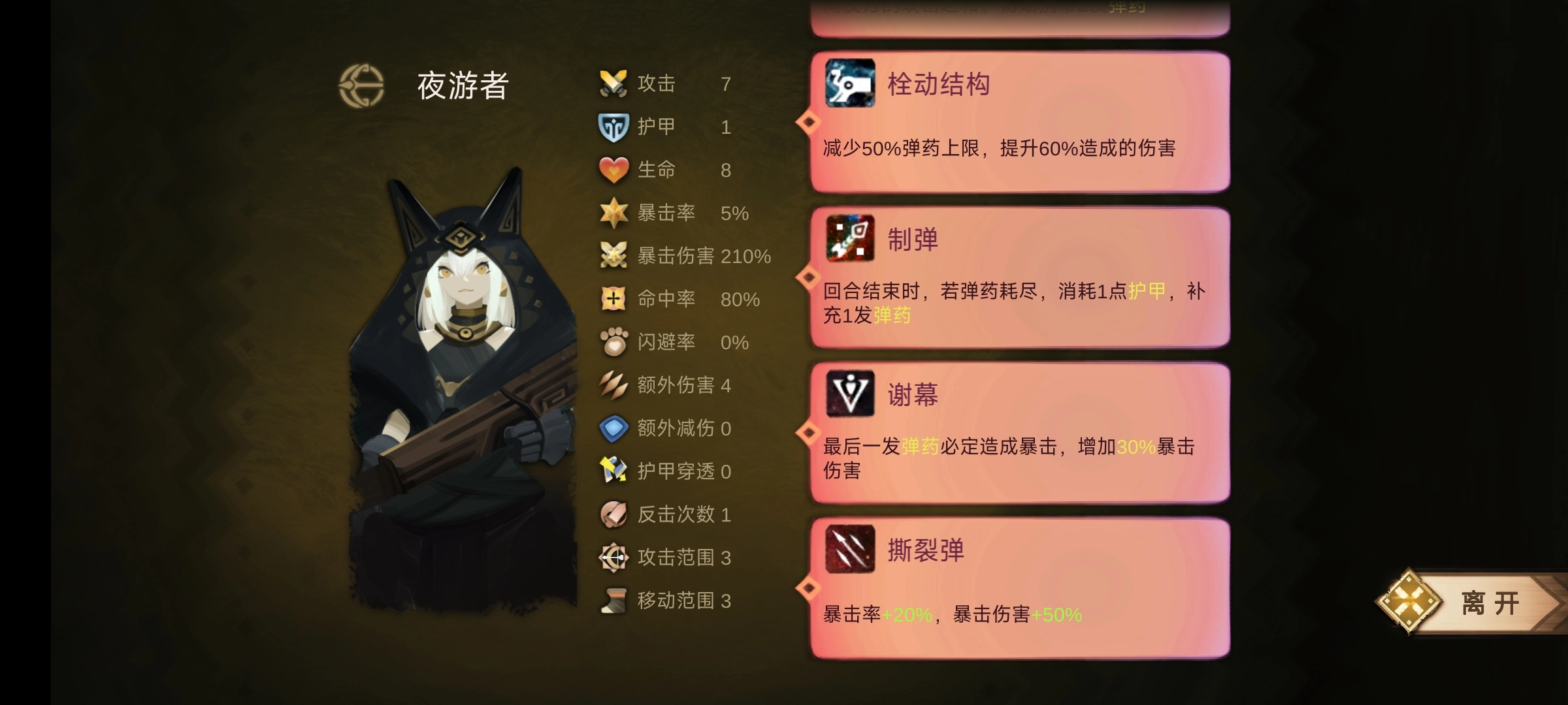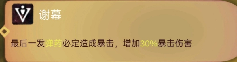 雷石和夜游均属于拥有两发子弹的高伤害角色,栓动这一特性在提供大量伤害加成的同时,将她们的弹药数量压缩至一发。在此情形下,搭配谢幕所具备的必定暴击效果,能打出极其惊人的伤害。