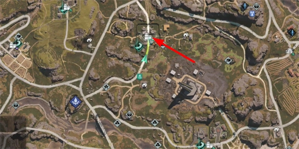 2. 接着依据提示朝着中途镇的东北方向行进,抵达后顺着箭头所指方向走进楼房。