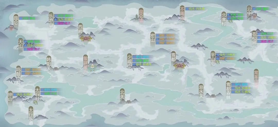 3、天山:采药可获得鬼草,伐木能得到沙树木,捕猎可捕获兔子。