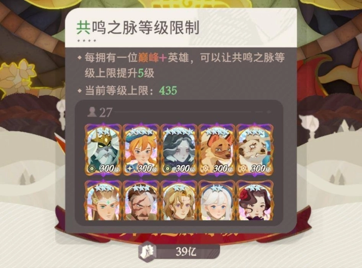 7、每当拥有一名巅峰+英雄时,共鸣之脉的等级上限便会提高5级。