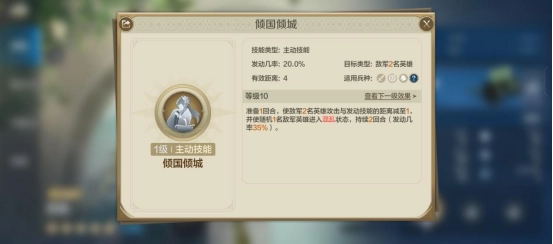 准备1回合,让敌军2名英雄的攻击与发动技能距离缩短至1,同时使随机1名敌军英雄陷入混乱状态,该状态持续2回合(发动几率为35%)。
