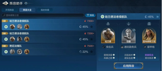 在阵容搭配上,图特摩斯三世拥有永续debuff,这一特性让他极其适配续航队。不过,由于其坦度欠佳,所以必须携带强力的奶妈或者减伤类英雄。这里比较推荐“凯撒”或者“艳后”。而输出英雄的挑选相对灵活,“秦始皇”“查理曼”“孙武”等都可以,重点在于追求稳定的输出。