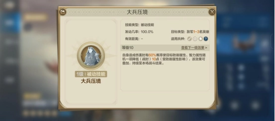 其自带技能“大兵压境”,满级效果为: