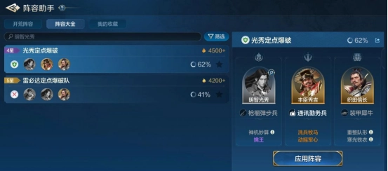 要是让明智光秀担任主C,命运羁绊阵容会是个挺好的选择。要是作为副C,那基本上就是“织田信长”或者“图特三世”加上明智光秀,再搭配智力输出英雄。这里智力输出英雄的可选范围很广,优先挑选控制流、续航能力强的,爆发型和追击型的相对靠后。官方推荐的阵容搭配中,“雷必达”就非常合适。
