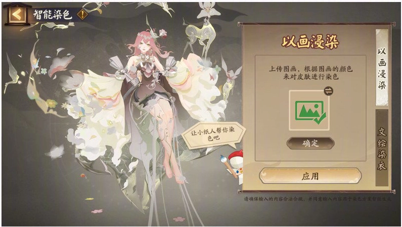 阴阳师大人于「心染」或「印染」玩法里,借助「智能染色」功能,输入图片或者文本,就能让小纸人依据内容自由发挥进行染色啦!
