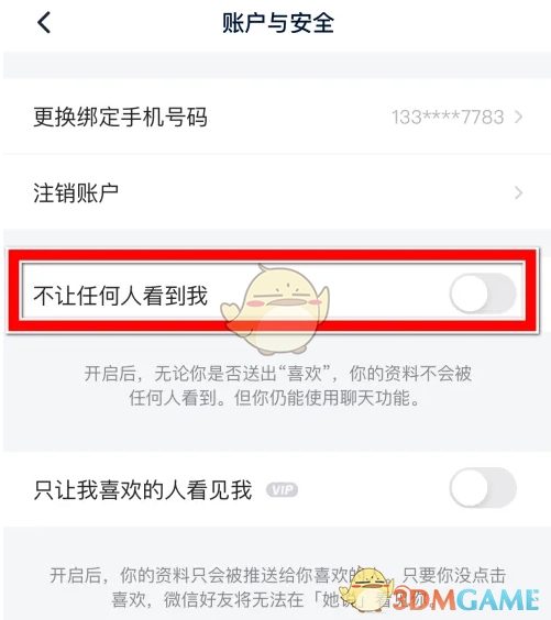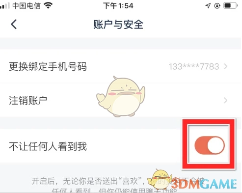 3、轻点“不让任何人看到我”选项右侧的开关。