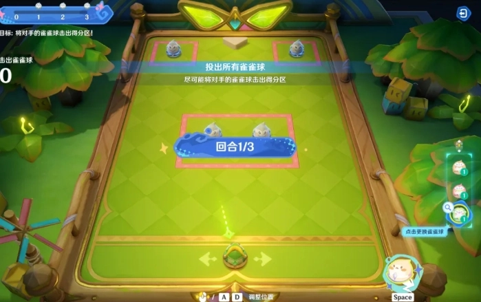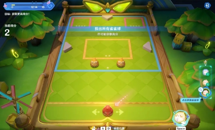 从底线的最左端与最右端,分别朝着场上现有的两个普通球发射两个贴贴球,蓄力程度约为四分之一,如此四个球便能都停留在中心的红框之中。