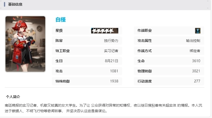 白槿对所选敌人造成相当于自身攻击力258.98%的物理伤害。若目标处于控制效果之下,白槿对其造成的伤害提升50%。当我方队伍中有独行势力阵营的队友时,白槿使用此技能可使自身暴击率提高20%。